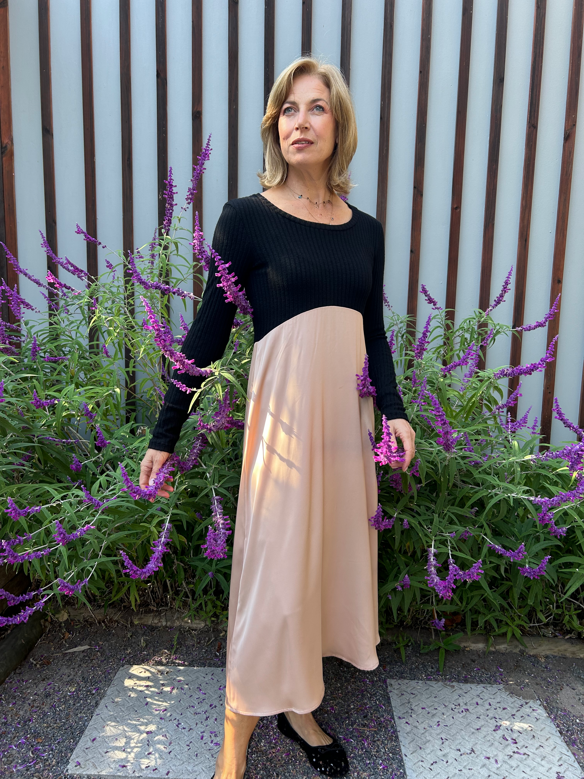 A cozy and soft knitted bodice with a silky satin skirt.