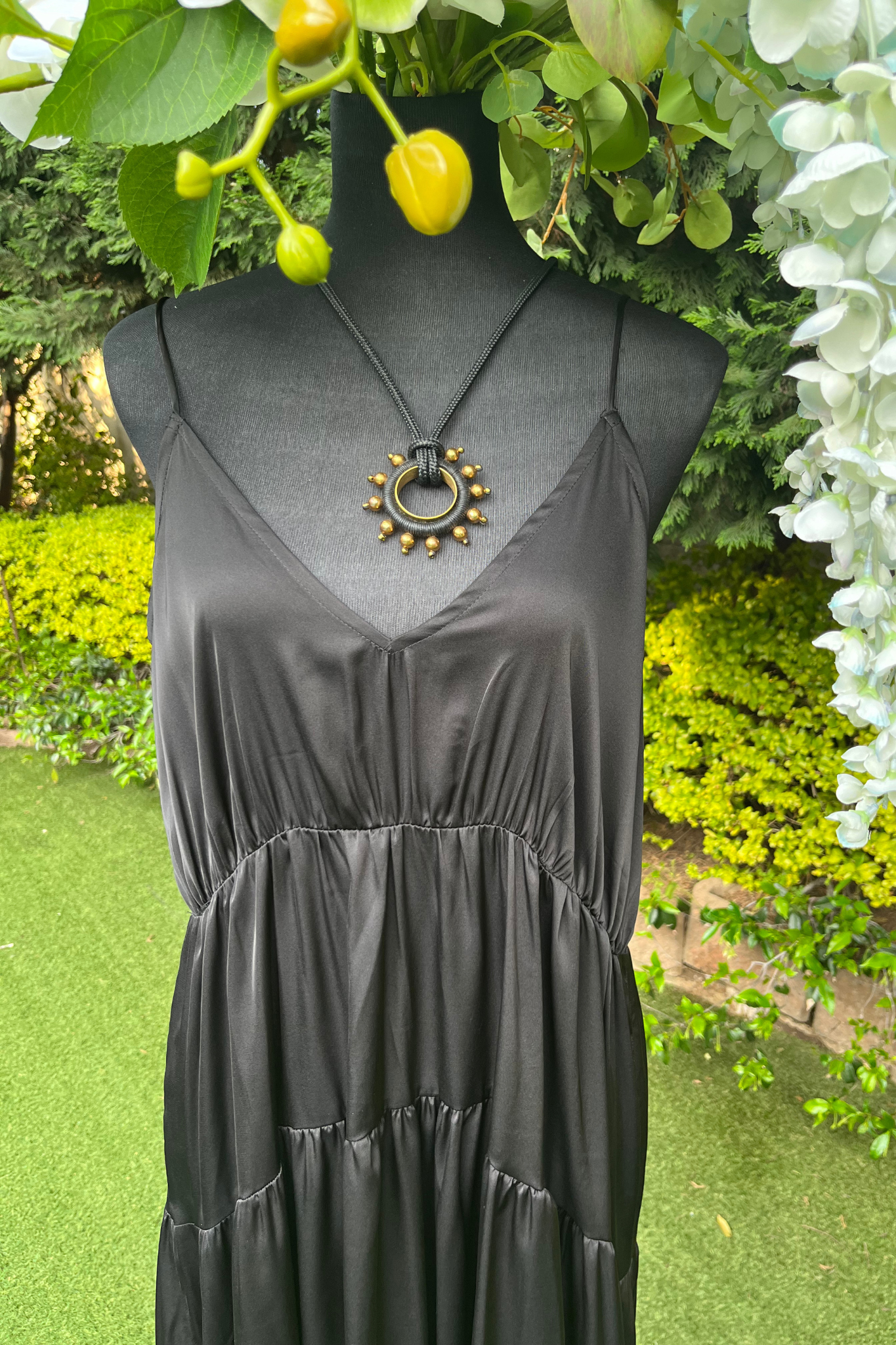 Adjustable shoe string shoulder ties and a gently tiered skirt.