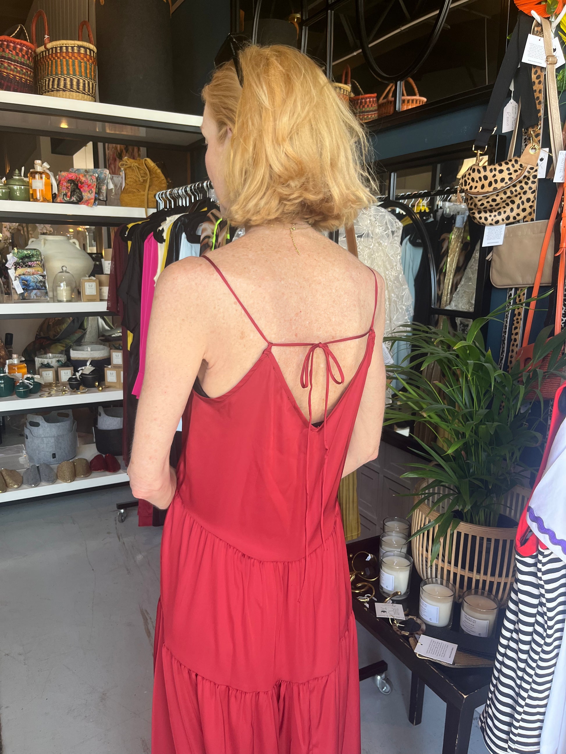 Adjustable shoe string shoulder ties and a gently tiered skirt.